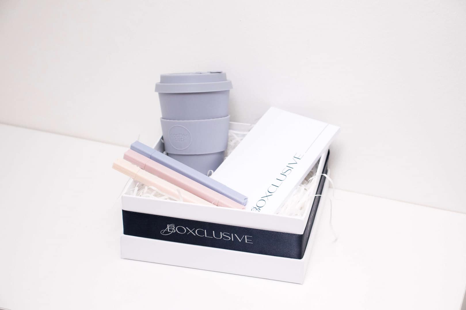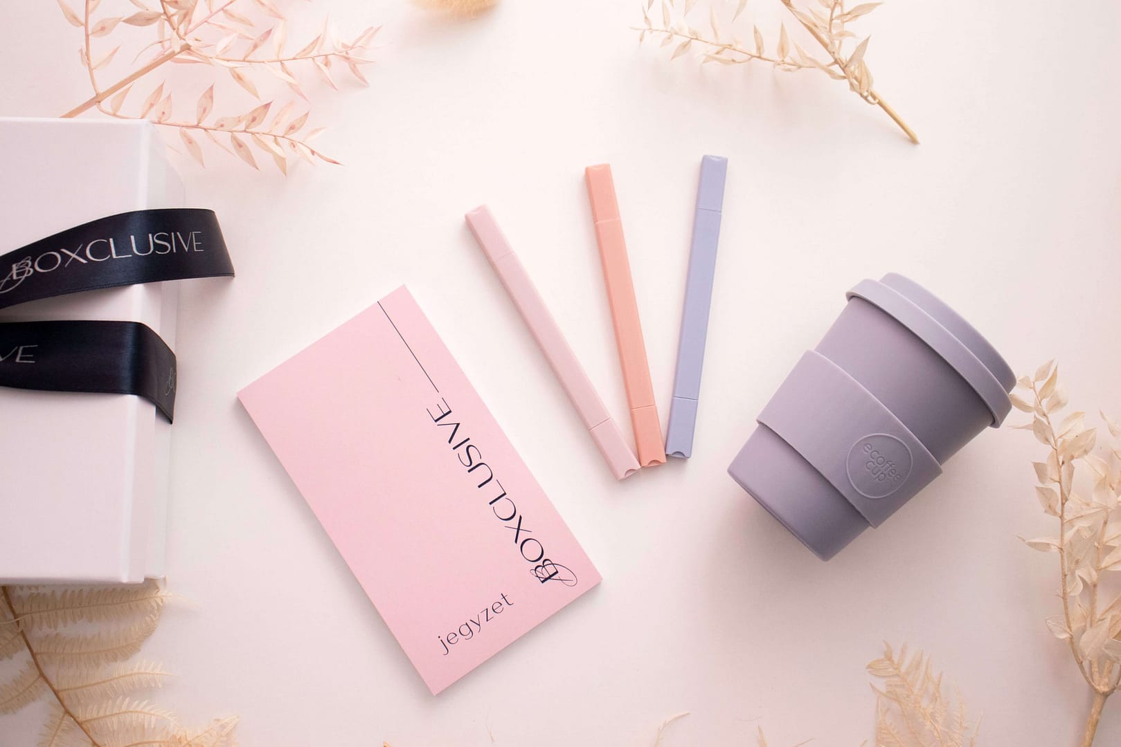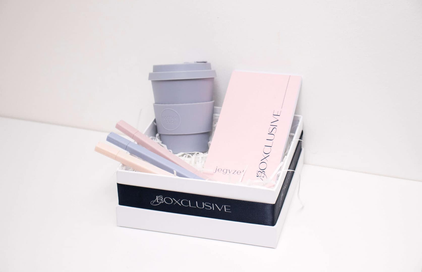 Az Elegant Office Classic ajándékcsomag tartalmaz egy elegáns jegyzettömböt, amelynek oldalain végtelenül szárnyalhat a kreativitás. Szövegkiemelője segít kiemelni a fontos információkat, míg az újra felhasználható kávés bögre gondoskodik a környezettudatos kávézás pillanatairól a nap folyamán.